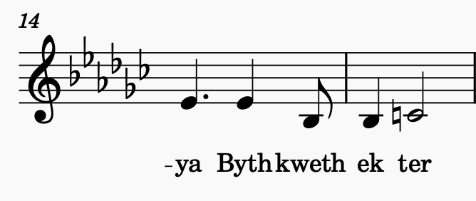 In the word bythkwethekter (eternity), the stress is on the third syllable, ‘ek’, so it is at the beginning of the bar. It isn’t the longest note, however, and that’s fine, as Cornish is not stress-timed. Raising the pitch would also work.