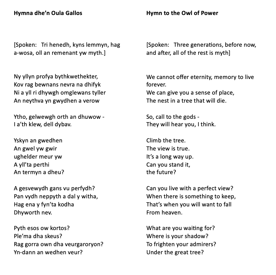 This was my first attempt to create a song directly from the sound of a spoken poem. It should come as no surprise to learn that I did not write the original words. The very loose translation into Cornish (from a translation to English) is mine, and that is what I set to music.