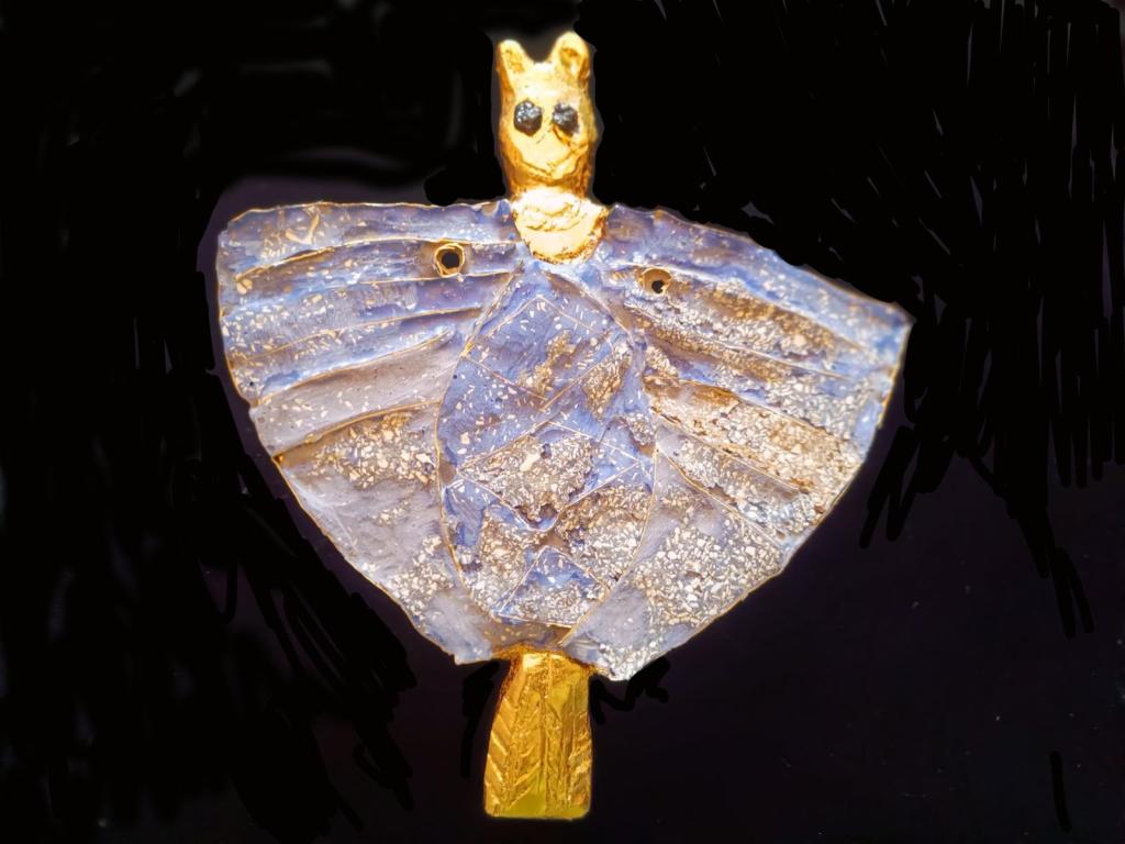 This pectoral is relinquished at GATE IV. It is made of carved bass wood, gilded, with the wings made of brass inlaid with the questionable faience paste – the blue is from proper ultramarine and cobalt pigments, though, which is (I think) from lapis lazuli. I had no idea what Inanna’s pectoral would look like. This looks a lot like a bat in a cape, but it’s meant to represent a lion-headed eagle, a symbol of the Sumerian goddess Ningersu. The original, from 2500BCE, is made of gold (head and body), copper (wings) and lapis lazuli. One consequence of trying to reproduce artworks from the past is that a real appreciation of the expertise of ancient artisans develops.