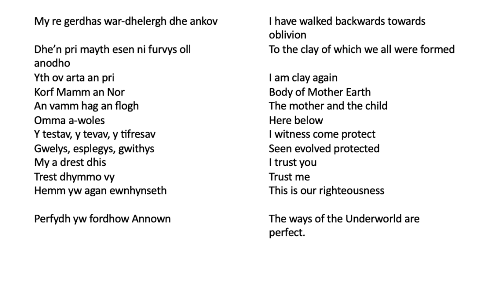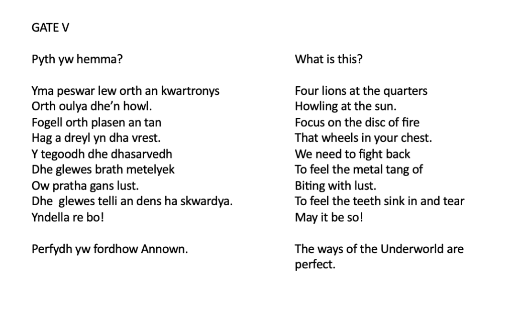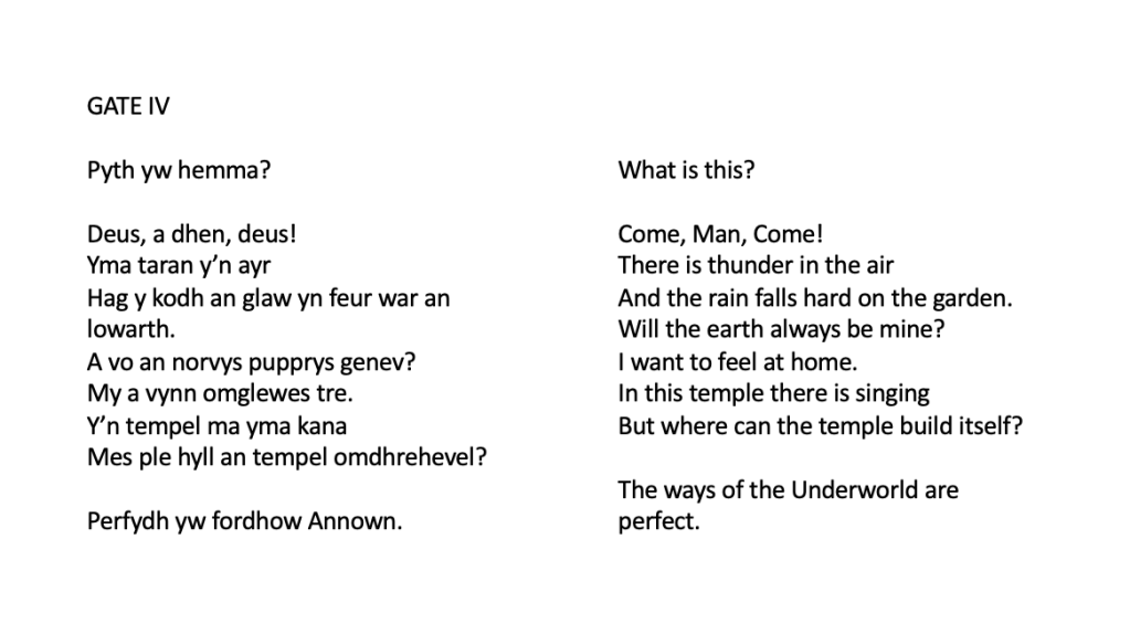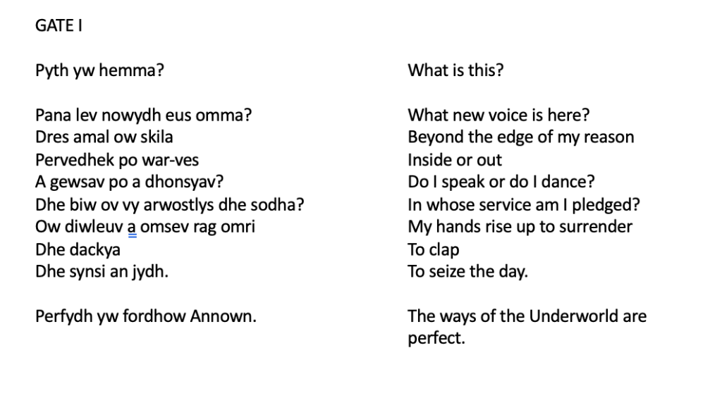 Each gate is represented by a film, showing associations with the gate, and containing the words of the poem for that gate. Some are spoken and some are sung. All of the words for the ritual are in Cornish.
