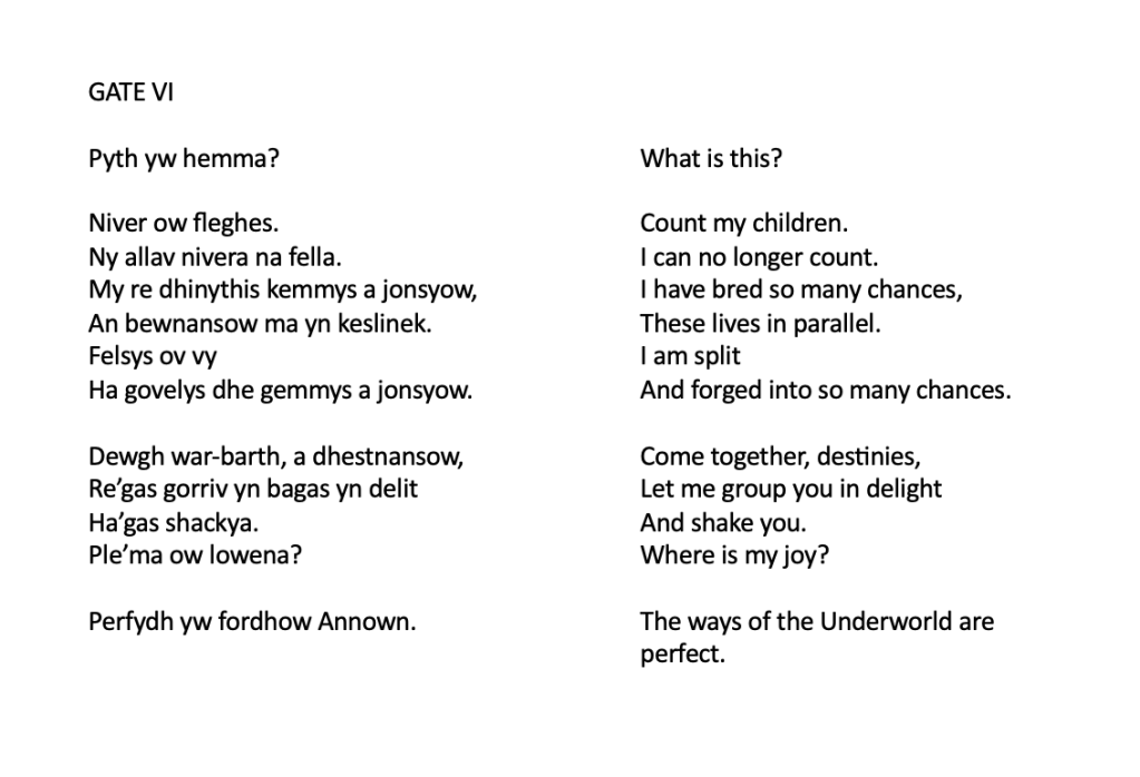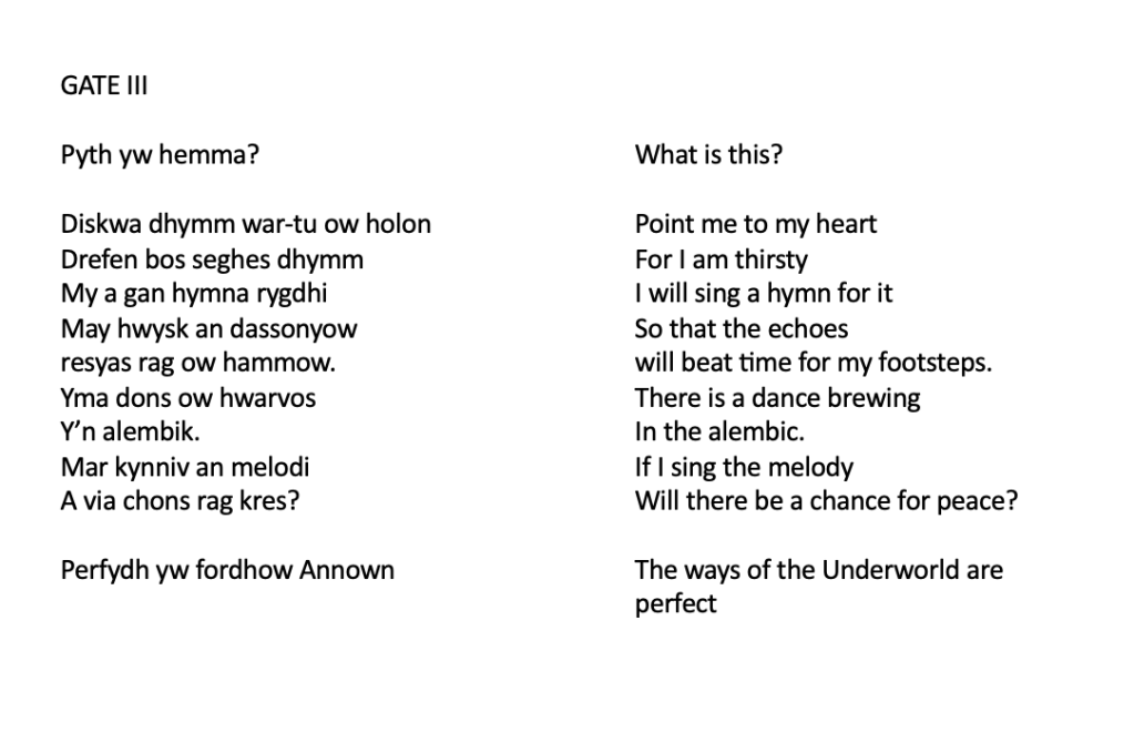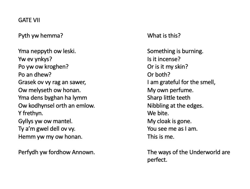 At the end of each film, the live Inanna asks: [“Pyth yw hemma?” What is this?] The reply, spoken from the film, is: “Perfydh yw fordhow Annown” [The ways of the Underworld are perfect]
